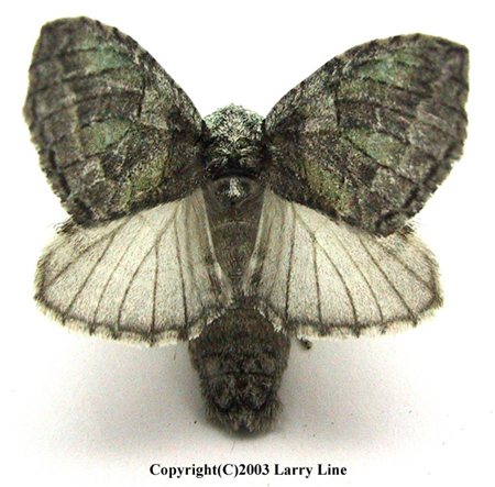 The 2002 (M) image was taken June 3rd. The 2003 (M) images, which are from the same moth, were taken June 26th @ H. Larva feed on maples and oaks.
