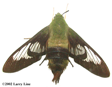 The 2002 (M) image was taken during the period of July 19th to August 3rd @ H. The 2004 image was taken July 21st. The 2005 image was taken August 3rd. The adults hover at various nectar producing flowers such as Honeysuckle, Impatients, Budlea.